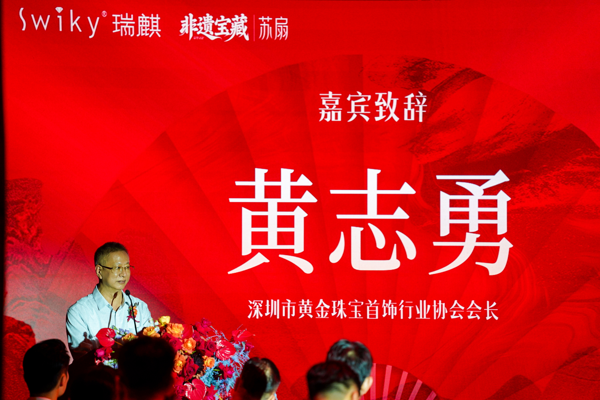Mr. Zhuo Hancai, General Manager of Swiky Jewelry; Ms. Su Xiaohong, Deputy General Manager; Ms. Zhou Shaoling, Deputy General Manager; Ms. Sheng Chun, Master of Chinese Fan Craftsmanship and National-level Inheritor of the Intangible Cultural Heritage of Suzhou Fan Making; Mr. Huang Zhiyong, President of the Shenzhen Gold & Jewelry Association; Mr. Jia Shuchang, Head of Research, China, at the World Gold Council; Mr. Zhang Qi, Manager of Industry Expansion and Marketing, China, at the World Gold Council; Mr. Zhang Wenyang, Secretary General of the Shenzhen Gold & Jewelry Association; Mr. Wang Zhen, Director of the Shenzhen Jewelry Museum, along with distinguished representatives from the national retail industry, attended the event. The gathering brought together numerous luminaries and guests, collectively witnessing this brilliant moment.Mr. Huang Zhiyong, President of the Shenzhen Gold & Jewelry Association, delivered the opening address. He stated that Swiky Jewelry's deep integration of intangible Suzhou fan craftsmanship with gold jewelry represents a crucial innovative move to explore new industry avenues and empower products through culture.