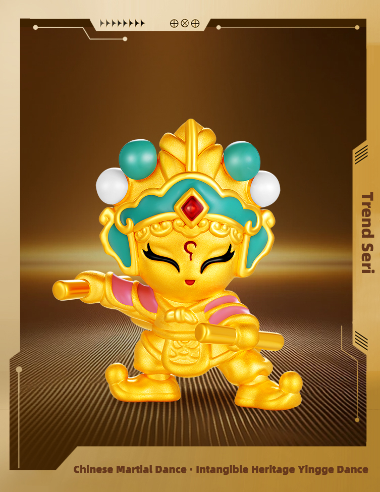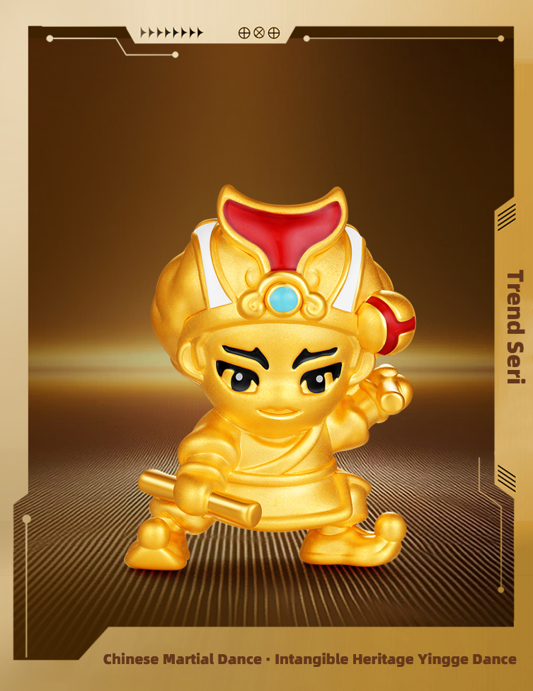 At the strike of a gong, the curtain of history is thrust open. Across the vast land of China, the heroic figures of Yingge burst forth like thunder and lightning, traversing mountains and ages, resounding with undiminished power to this day. This is the soul of intangible heritage, tempered by time; an Eastern war dance where strength meets beauty; a heroic narrative deeply etched into collective memory. The Chinese Martial Dance · Intangible Heritage Yingge Dance Series takes 5D hard pure gold craftsmanship as its structural core, re-sculpting the powerful physiques and dynamic instants of Yingge figures. The surface is treated with a diamond-sand finish, allowing gold to shimmer with star-like brilliance, as if tracing the sharp gusts stirred by the heroes’ swinging batons. In the finer details, high-saturation color-gilding techniques are meticulously applied: the intense hues of battle attire, the bold patterns of facial masks, and the piercing vitality of the eyes are rendered with lifelike precision. Through a dialogue between modern technology and ancient spirit, intangible heritage is reborn within the eternity of pure gold, gaining a renewed dimension of life.