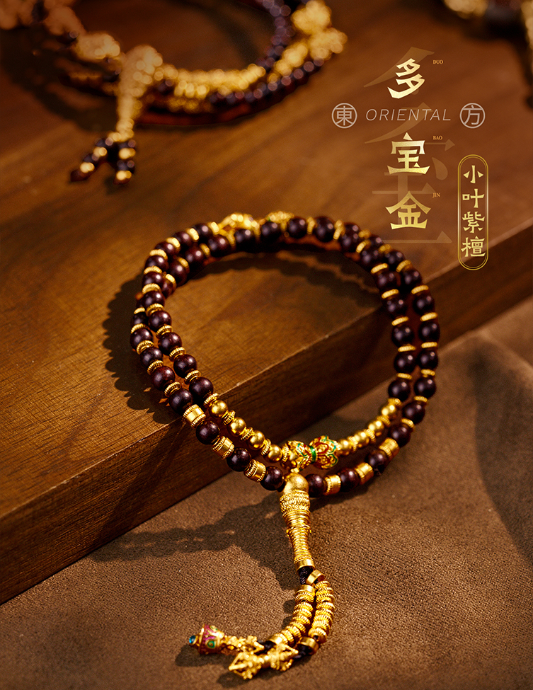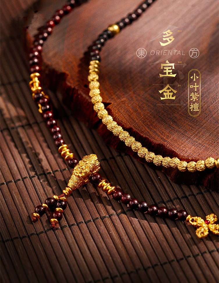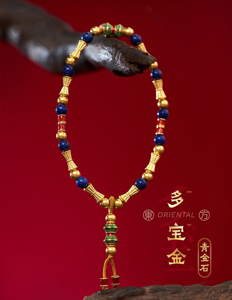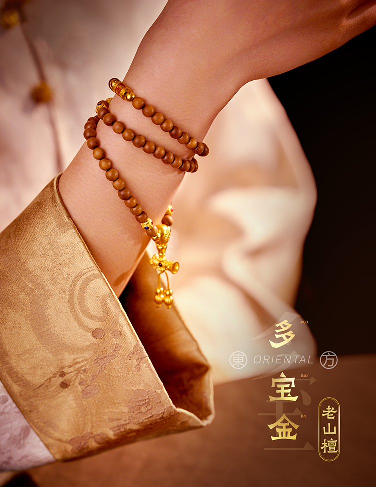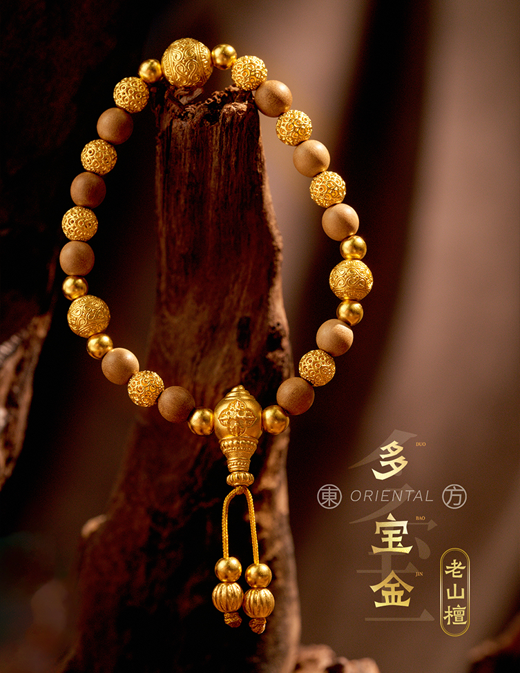 用多种材质搭配古法金做成文玩手串,更赋予吉祥寓意