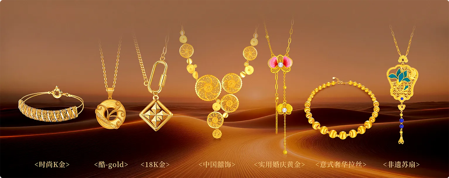 连续5年,登榜中国黄金首饰十大加工量企业和世界黄金协会古法金、硬足金联合推广商,国际铂金协会推广供货商。产品全品类覆盖古法金、5G黄金、足金、精品足金、3D硬金、5D硬金、古法镶嵌、5G镶嵌、5D镶嵌、18k金、4D-18K、22K金、铂金等。